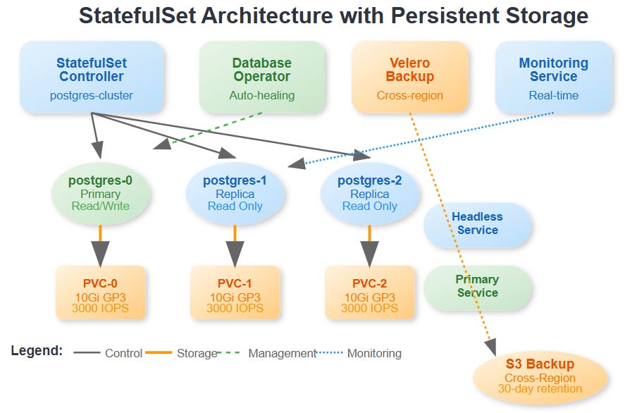 When Netflix deploys their recommendation engine’s database cluster, each database node needs its own persistent identity. Node-0 might be the primary writer, Node-1 and Node-2 are read replicas. If Node-1 crashes and comes back, it must resume as Node-1 with its exact same data - not become Node-3 with fresh storage.