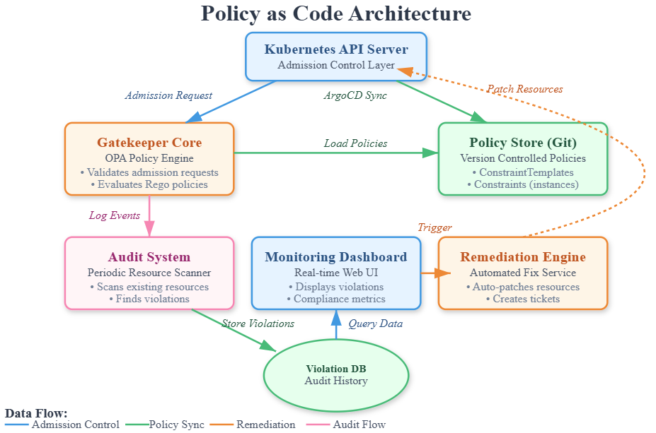 Policy as Code sits at the Kubernetes admission control layer, acting as a gatekeeper between users and the API server. It integrates with your GitOps workflow from Day 24 - policies are stored in Git, synced via ArgoCD, and enforced automatically. Your External Secrets Operator ensures policies can’t be bypassed by hardcoded secrets. The monitoring system feeds into your observability stack, creating a closed-loop security system.